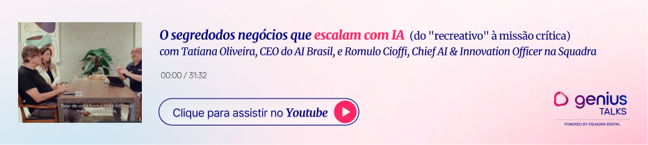 Na primeira parte do primeiro episódio da nova temporada do Genius Talks, Alcebíades Araújo, AI Specialist na Squadra, recebeu Tatiana Oliveira, CEO do AI Brasil, e Romulo Cioffi, CIOO and Chief AI Officer na Squadra, para uma discussão franca sobre porque algumas empresas já colhem resultados bilionários com a IA, enquanto outras ainda tropeçam em expectativas irreais.
